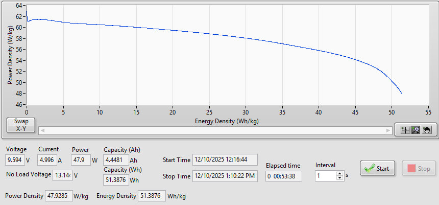 5A to 9.60V | Duration 00:53:38 3205s ~4.4481 Ah ~51.3876 Wh |