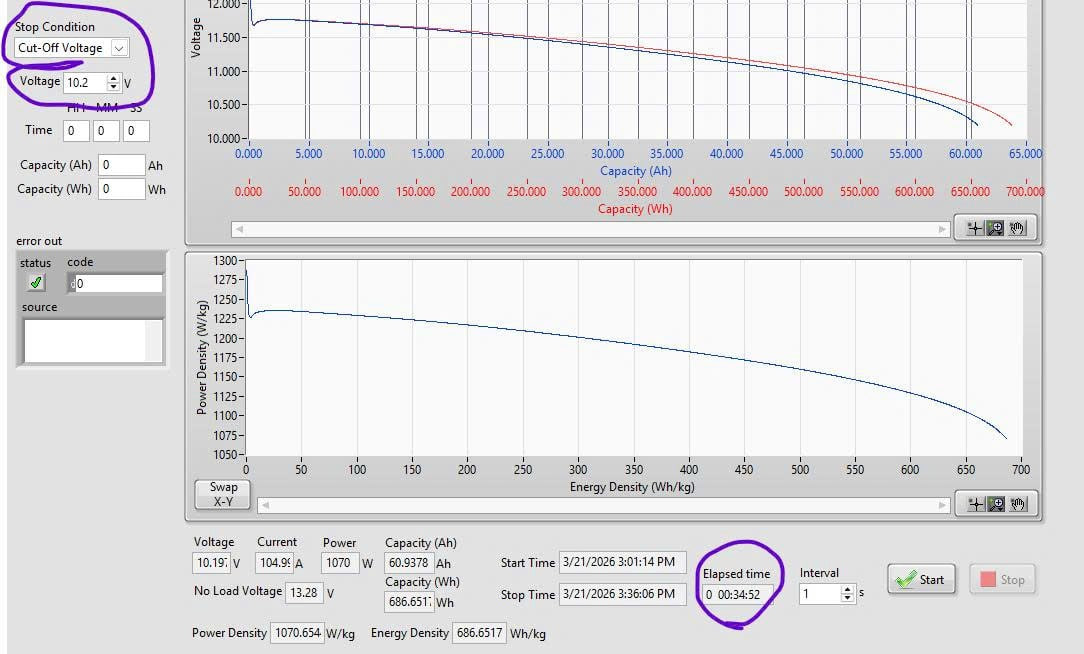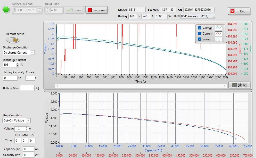 75A to 9.60V | Duration 00:51:31 3080s 64Ah 720Wh |
